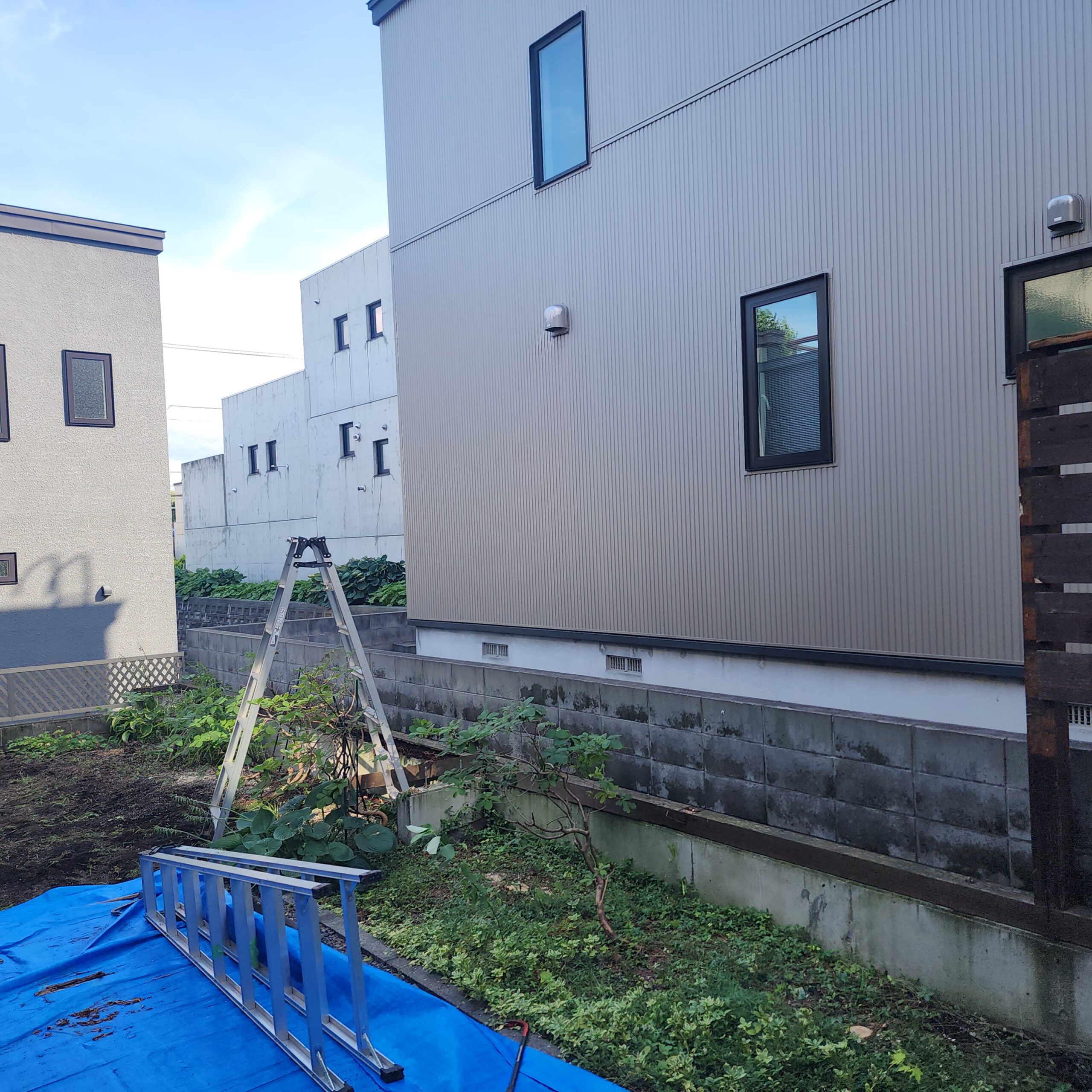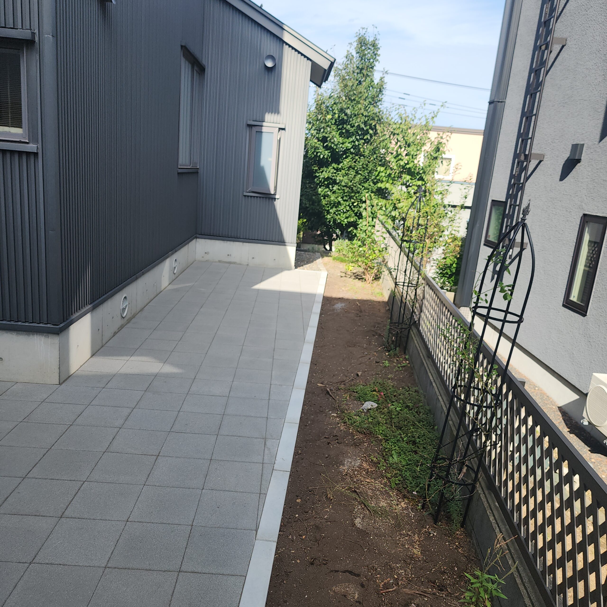2024.09.18 リフォーム希望の方へ 中庭外構 札幌市内にて内窓新設させていただいたお客様より、雑草対策と朽ちてきてしまった木製フェンスの改修、背が伸びすぎて光を遮りすぎてしまっているコニファーの伐採をさせていただきました。 明るい中庭になり、コンクリートショット平板下には防草シート敷いたので、雑草の処理も軽減されてこれから、ご家族でお花など植えて素敵な庭になっていくと思い楽しみですね。 既存 木製フェンスと植栽 木製フェンス撤去と植栽伐採 植栽伐採とコンクリート平板敷設 アルミ製フェンス新設とコンクリート平板敷設完了 一覧に戻る